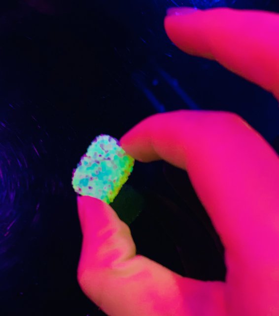 この緑色の物体は一体何だと思いますか?ピントがボケていますが、グミなんです!ブラックライトで発光しちゃうんです!Melindaにおける第一発見者は「面白い!」ってなると#@&☆%♡∞様です!